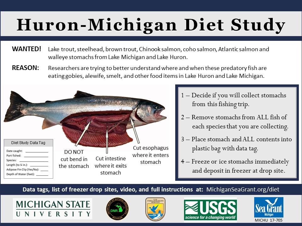 Any and all information that anglers can collect and provide to our biologists to assist in fisheries management is helpful and important. The attached link is to collect stomachs for content analysis. It contains how to properly collect stomachs, label and drop off sites on Lakes Michigan and Huron. Prof. Brian Roth from MSU presented data at the Ludington Workshop, L. Huron Citizens Advisory Council meeting and this weeks GLFC-Lake Michigan Committee meeting. It is important to record as much information as you can and to do this throughout the fishing season which will demonstrate diets spatially and thru time.